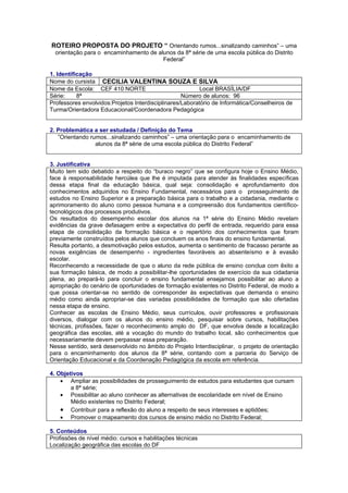 Este documento propõe um projeto de orientação para alunos da 8a série de uma escola pública no Distrito Federal para auxiliá-los na escolha de cursos de ensino médio. O projeto inclui mapear escolas técnicas e de ensino médio, visitas monitoradas, entrevistas com profissionais, testes vocacionais e divulgação de editais para ajudar os alunos a refletirem sobre seus interesses e opções para o futuro.