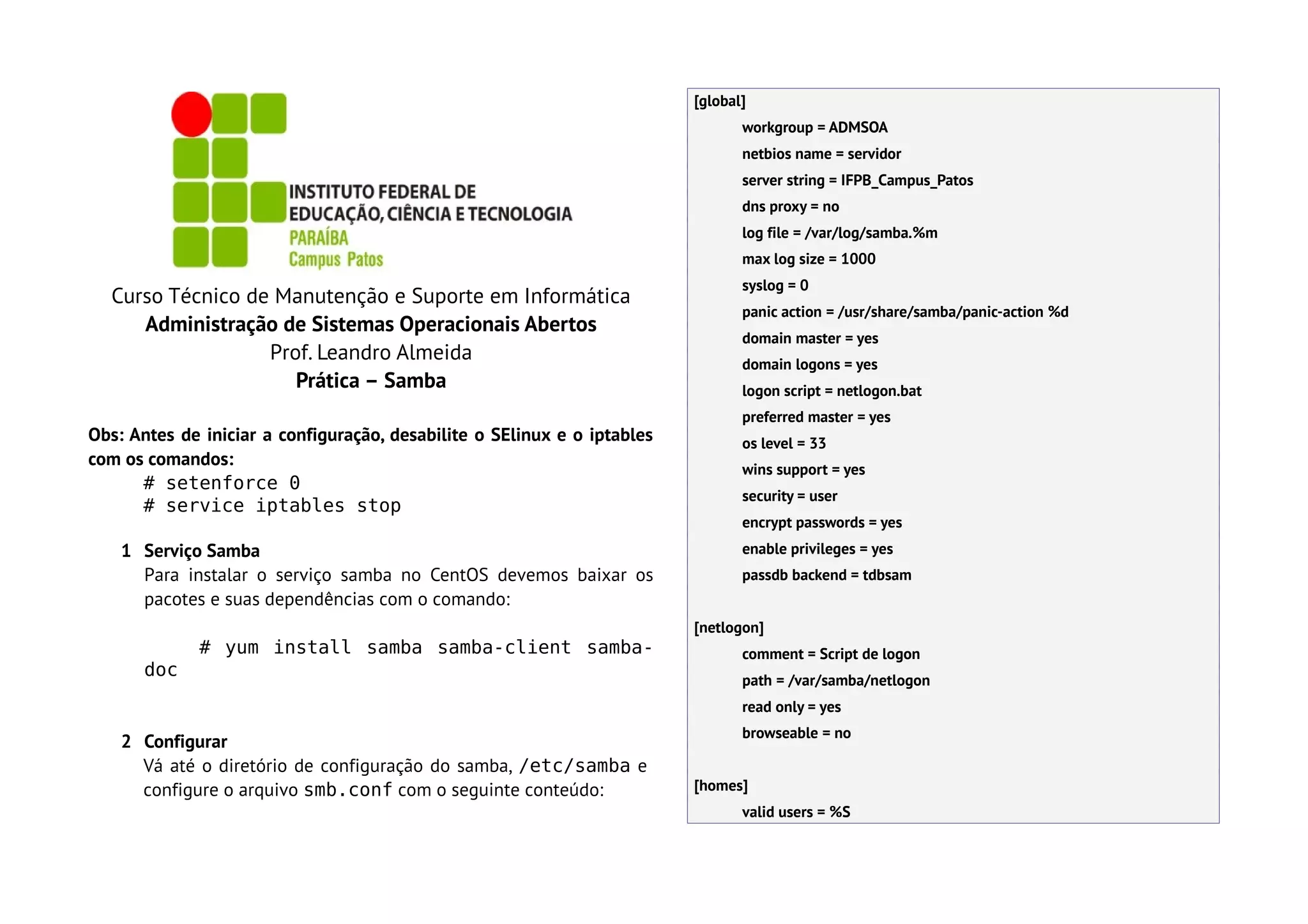 O documento descreve os passos para configurar o serviço Samba em um servidor CentOS para compartilhamento de arquivos e diretórios. Inclui a instalação do pacote Samba, a configuração do arquivo smb.conf, a criação de usuários e diretórios compartilhados, e como configurar clientes Windows para acessar os recursos compartilhados.
