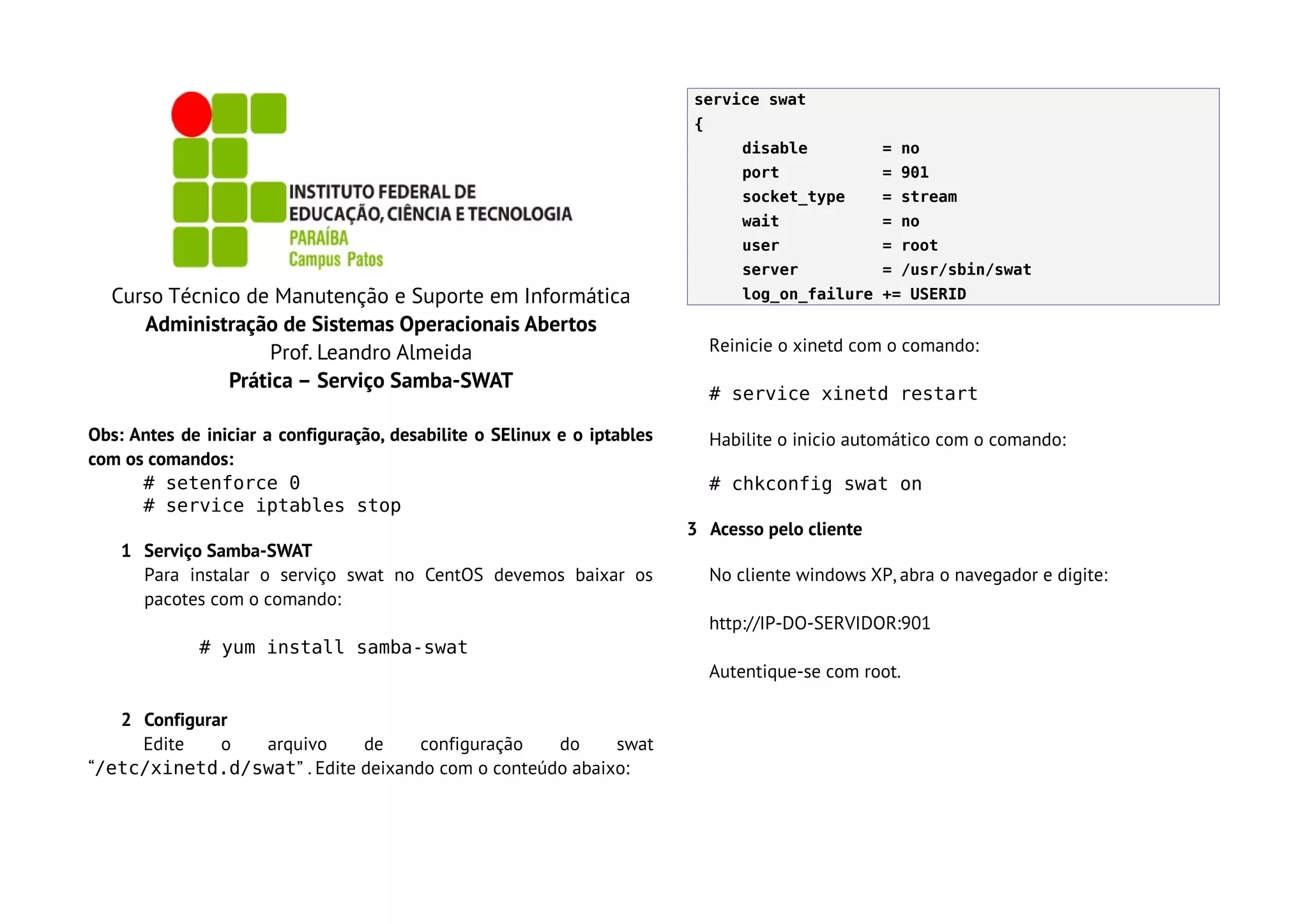 O documento descreve como configurar o serviço Samba-SWAT em um sistema CentOS para fornecer acesso de administração remota via navegador web. Ele inclui instruções para instalar o pacote swat, editar o arquivo de configuração xinetd.d/swat para habilitar o serviço na porta 901 e reiniciar o serviço xinetd para ativar a configuração. Também fornece instruções para habilitar o serviço swat no boot e acessá-lo via navegador web no IP do servidor na porta 9