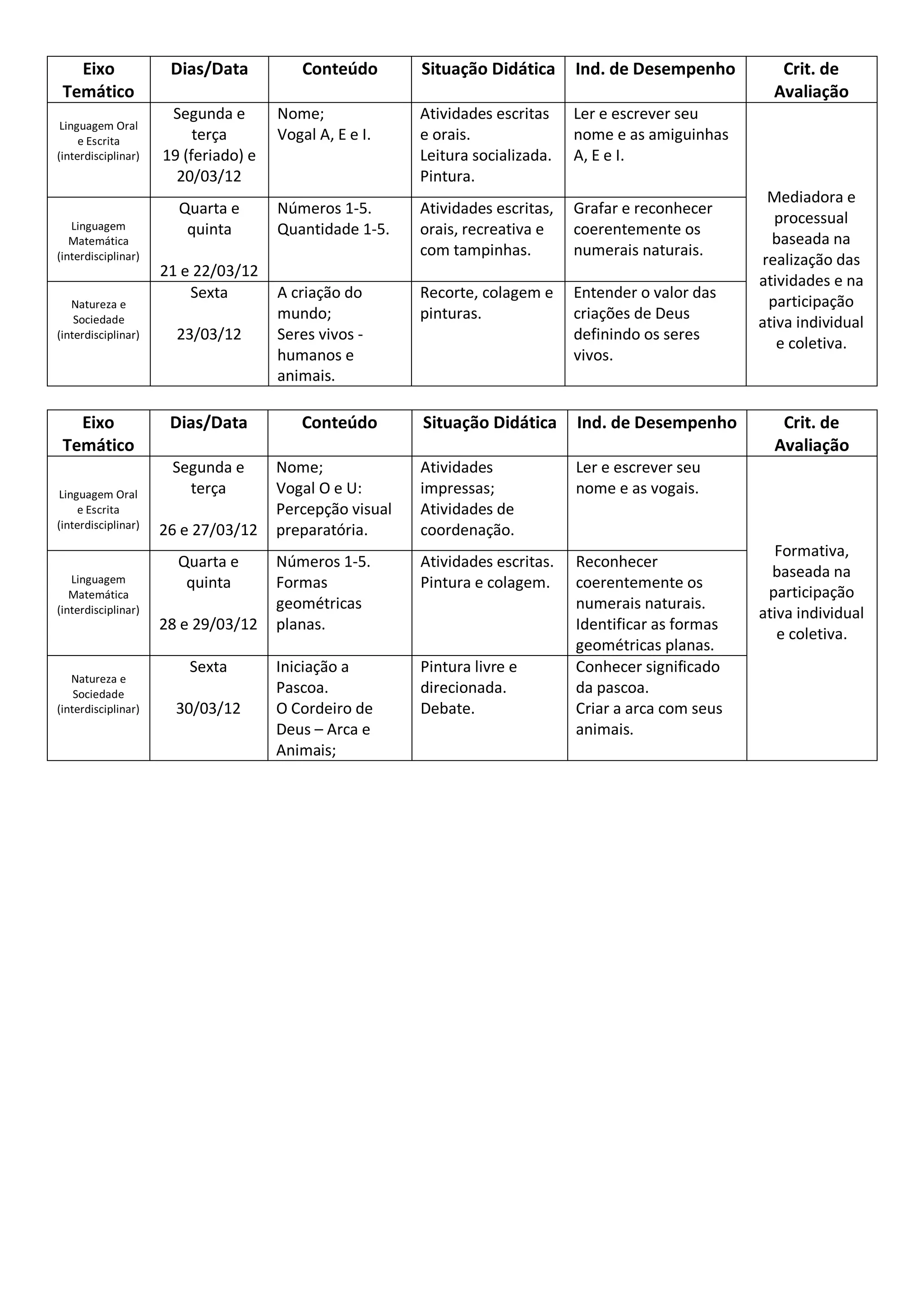 O documento apresenta os conteúdos, atividades e critérios de avaliação de diferentes eixos temáticos ao longo de várias semanas para alunos do ensino infantil. Nas primeiras semanas, os temas incluem o alfabeto, números, seres vivos e a criação do mundo. Nas semanas seguintes, os alunos aprenderão sobre a Páscoa, formas geométricas, o eu, habitação e seres vivos. As atividades envolverão escrita, pintura, colagem e debates, com