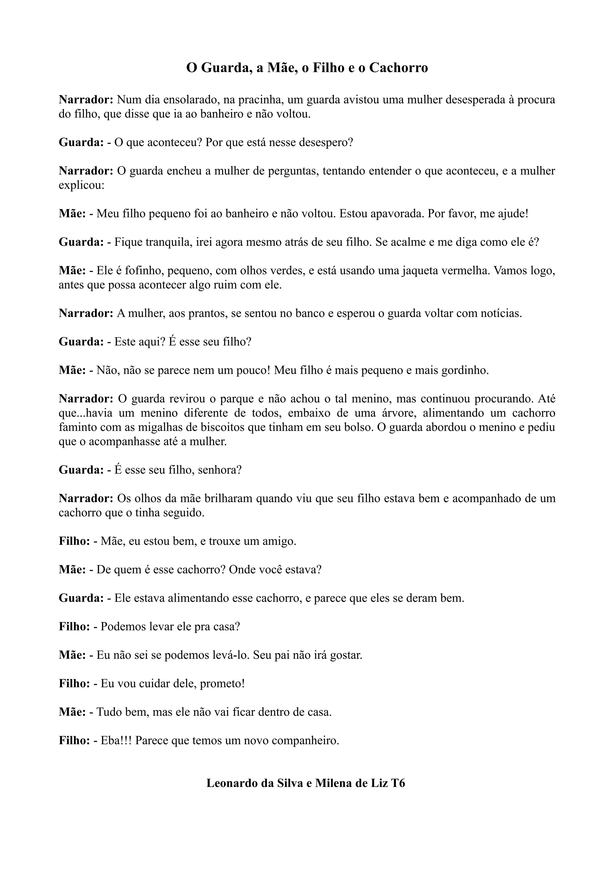 Uma mãe estava desesperada procurando pelo filho que havia ido ao banheiro e não voltou. O guarda ajudou na busca e encontrou o menino alimentando um cachorro faminto com biscoitos. Embora outros meninos tenham sido confundidos, o guarda finalmente achou a criança, que pediu para levar o cachorro para casa. A mãe permitiu que o cachorro ficasse, mas fora de casa.