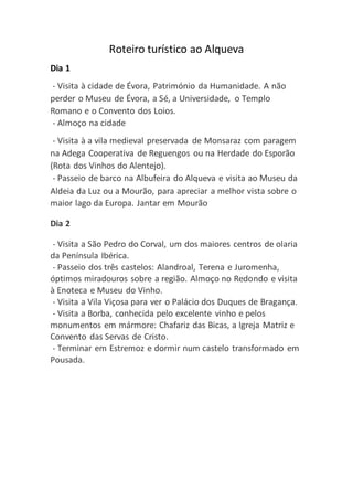 Este roteiro turístico de 2 dias ao Alqueva inclui: 1) Visitas a Évora, Monsaraz e passeios de barco no Alqueva no dia 1; 2) Visitas a São Pedro do Corval, três castelos, Vila Viçosa e Borba no dia 2, terminando em Estremoz.