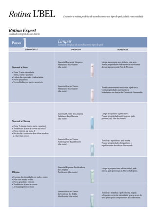 Este guia fornece informações sobre uma linha de produtos faciais L'BEL, incluindo rotinas de cuidados recomendadas para diferentes tipos de pele, idades e necessidades. A rotina expert é descrita como um cuidado integral diário em dois passos: limpeza e tonificação, seguido de nutrição e hidratação. Tratamentos temporários de alta concentração também são mencionados para uso de dois meses.