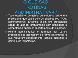 Rotinas administrativas são processos sistemáticos que requerem conhecimento técnico, científico e domínio de tecnologia para apoiar as funções de uma empresa. Elas incluem documentos como manuais de rotina, regulamentos internos e relatórios, além de métodos para garantir qualidade nos processos e objetivos da empresa. As empresas são divididas em departamentos como jurídico, marketing, compras, vendas, administrativo e operacional que se comunicam para solucionar problemas.