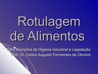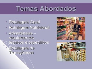 O documento resume os principais pontos da legislação brasileira sobre rotulagem de alimentos, incluindo informações gerais, nutricionais, de advertência e sobre transgênicos. A rotulagem tem o objetivo de proteger a saúde do consumidor e permitir escolhas alimentares informadas. A ANVISA estabelece os padrões para as informações obrigatórias nos rótulos de acordo com resoluções técnicas.