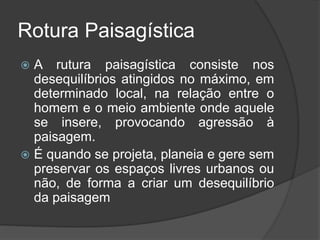 A ruptura paisagística ocorre quando há desequilíbrio na relação entre o homem e o meio ambiente em um local, agredindo a paisagem. O Centro Cultural de Belém em estilo vanguardista criou uma ruptura na paisagem dominada pelo estilo manuelino do Mosteiro dos Jerónimos. Embora haja polêmica sobre o impacto, a área apresenta diversos estilos arquitetônicos e significados históricos.