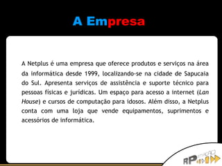 A Netplus é uma empresa de informática que oferece serviços como Lan House, cursos para idosos e assistência técnica. O documento analisa os públicos da empresa e seus interesses, e propõe estratégias de comunicação para melhorar a identidade visual da marca e o relacionamento com clientes, fornecedores e a comunidade.