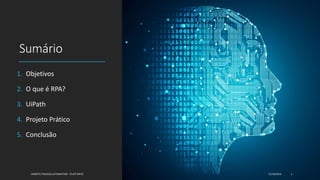 1. O documento discute Robotic Process Automation (RPA) e o software UiPath. Ele define RPA, explora suas gerações, benefícios e desafios, e apresenta as principais funcionalidades do UiPath. 2. O autor também demonstra na prática como otimizar uma carteira de ativos financeiros usando RPA no UiPath. 3. Em conclusão, o autor discute as vantagens e limitações do RPA e UiPath, como seu impacto em processos repetitivos e resistência ao change management.