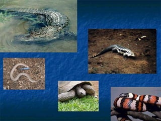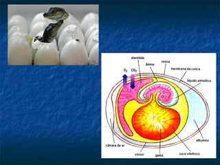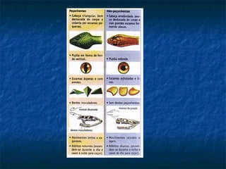O documento descreve as principais características dos répteis, incluindo que a maioria possui pele grossa e escamosa, respiração pulmonar e ovos com casca dura. Também menciona detalhes sobre o coração e classificação de alguns répteis como jacarés, lagartos e serpentes.