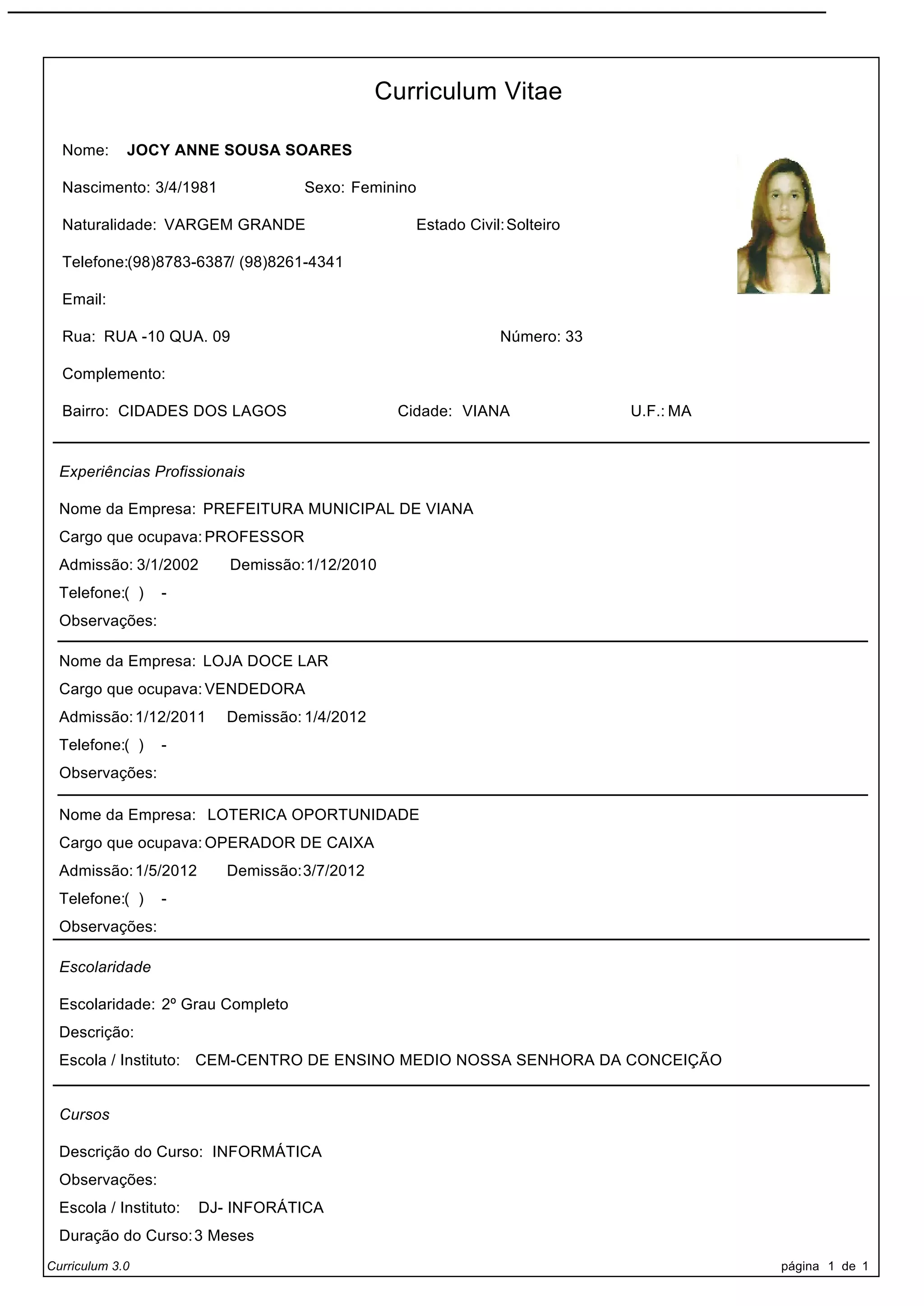 O currículo apresenta os dados pessoais e profissionais de Jocy Anne Sousa Soares. Ela tem experiência como professora, vendedora e operadora de caixa. Sua escolaridade é o segundo grau completo e realizou cursos de informática e operador de caixa.