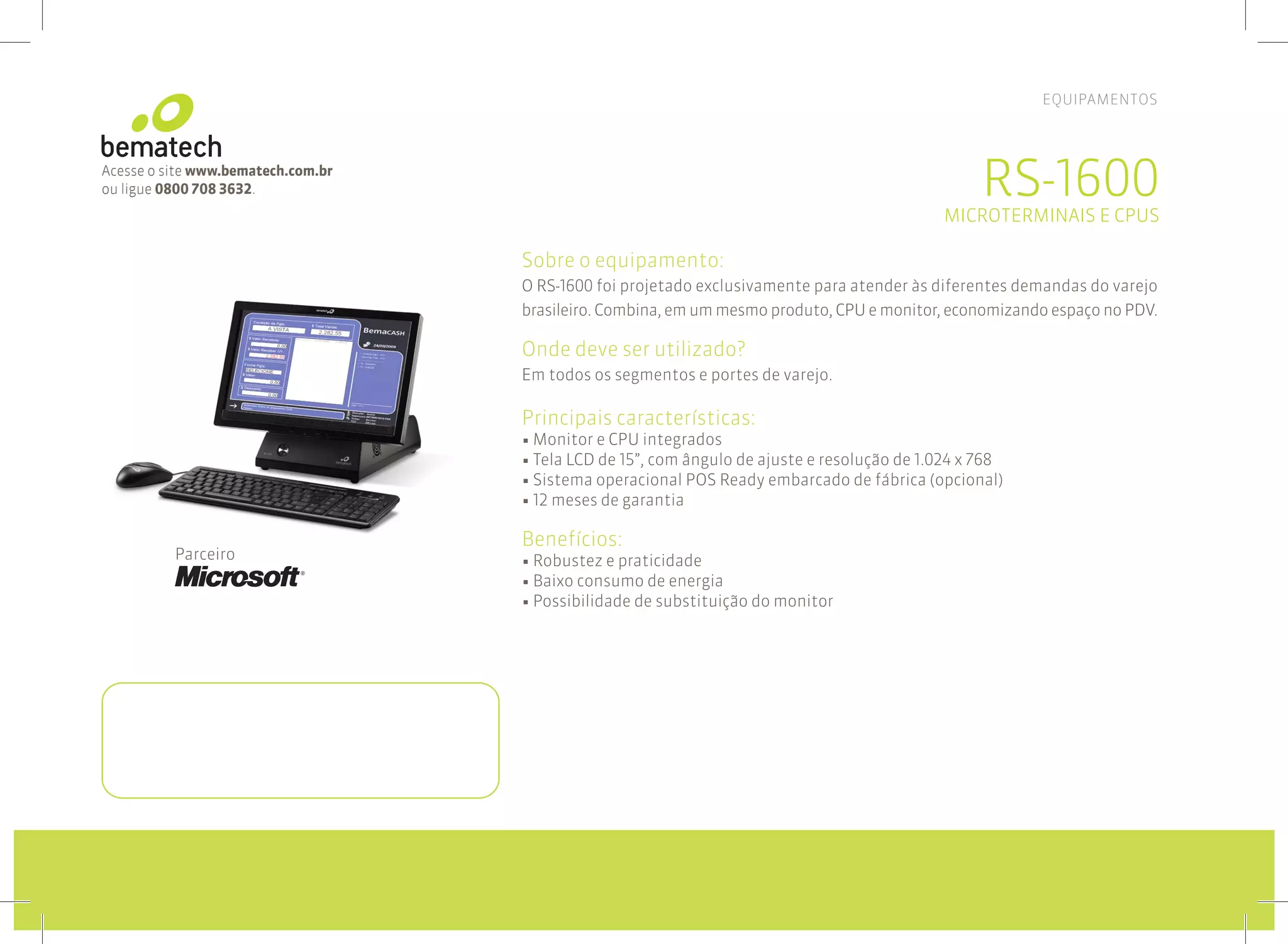 O documento descreve o equipamento RS-1600 da Bematech, um terminal de ponto de venda com monitor e CPU integrados projetado para o varejo brasileiro, oferecendo praticidade, baixo consumo de energia e 12 meses de garantia.