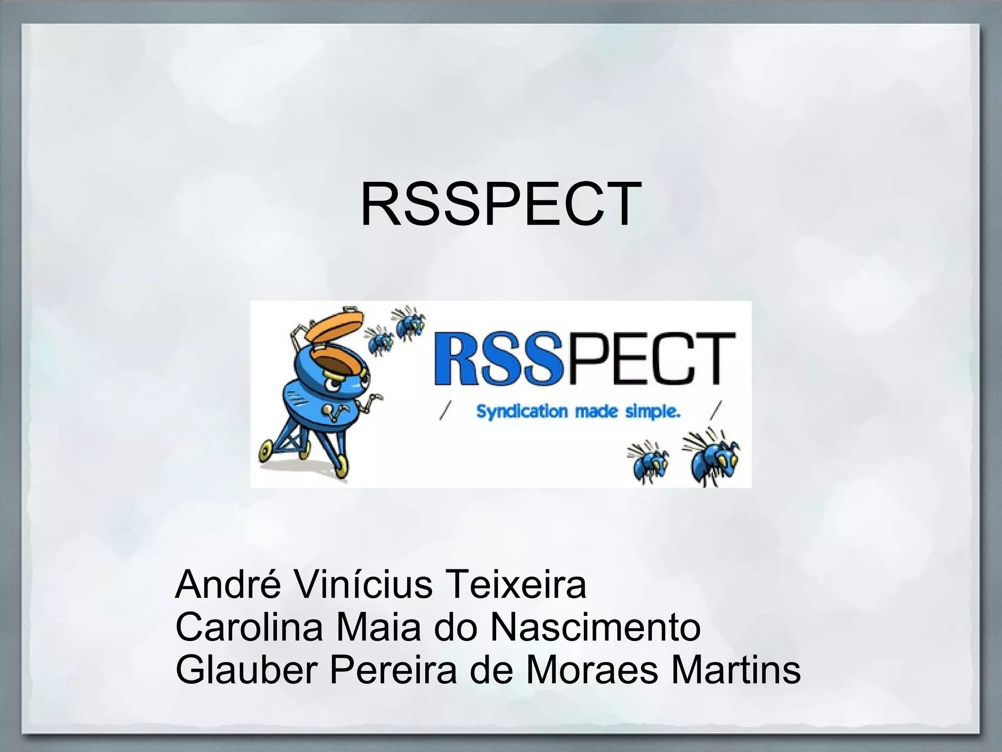 O documento descreve a ferramenta RSSPECT, que cria feeds RSS de três tipos: ANYSITE, MYSITE e PODCAST. Ela necessita de tags específicas como <span class="rss-content"> para o conteúdo, <span class="rss-title"> para o título e <span class="rss-link"> para o link.