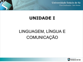 Este documento discute conceitos-chave de linguagem, língua e comunicação. Define linguagem como a capacidade inerente aos seres humanos de se comunicar através de sistemas de signos e símbolos. Distingue língua como o sistema de representação compartilhado por uma comunidade, enquanto fala é sua materialização. Por fim, comunicação é definida como o processo de interação e troca de informação entre indivíduos.