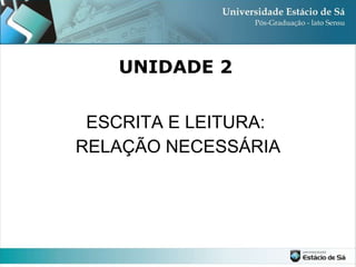 Este documento discute a relação entre leitura e escrita no contexto da produção acadêmica. Ele explica que a leitura é uma atividade complexa que ativa diversas capacidades cognitivas e que é necessário reler o texto, pesquisar palavras desconhecidas e identificar palavras-chave para entender as ideias-chave e o contexto do texto. Também recomenda analisar elementos como títulos, ilustrações e reconhecer estilos textuais para compreender completamente o que foi lido.