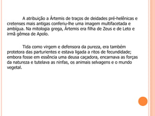 Ártemis era uma deusa grega filha de Zeus associada à caça, natureza e virgindade. Ela protegia animais selvagens, ninfas e parturientes, mas também tinha um lado cruel, matando aqueles que desrespeitassem sua pureza. Sua contraparte romana era Diana, venerada de forma semelhante pelos romanos como deusa da lua e caça.