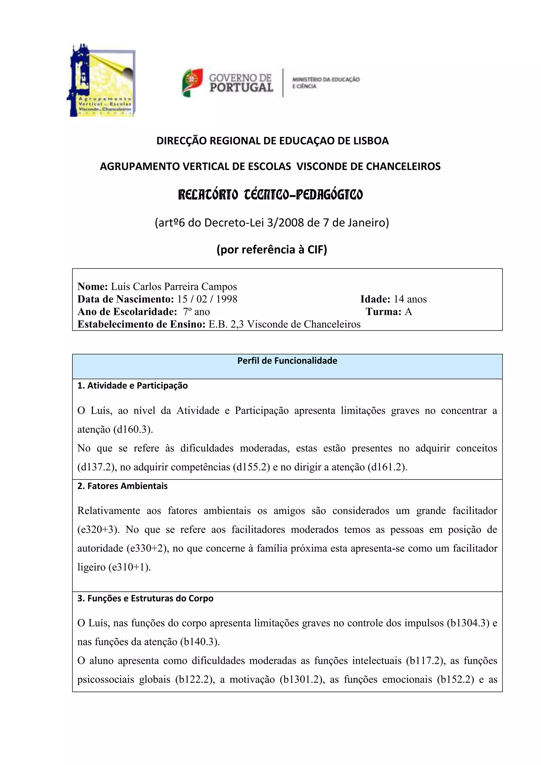 Este documento resume o perfil de um estudante, Luís Carlos Parreira Campos, que tem necessidades educativas especiais permanentes. Ele tem dificuldades graves de atenção e controle de impulsos e dificuldades moderadas cognitivas e emocionais. Um relatório psicológico confirma comprometimento cognitivo e perturbação emocional. Ele precisa de apoio pedagógico personalizado, adequações curriculares individuais e flexibilidade na avaliação.