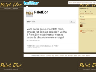 O documento resume um projeto de conclusão de curso para uma chocolateria chamada Palet D'or. O projeto propõe uma reformulação da marca da empresa para torná-la mais sofisticada e aumentar as vendas, além de uma campanha publicitária para incentivar vendas fora de datas comemorativas com foco em momentos especiais como amor, amizade e família.