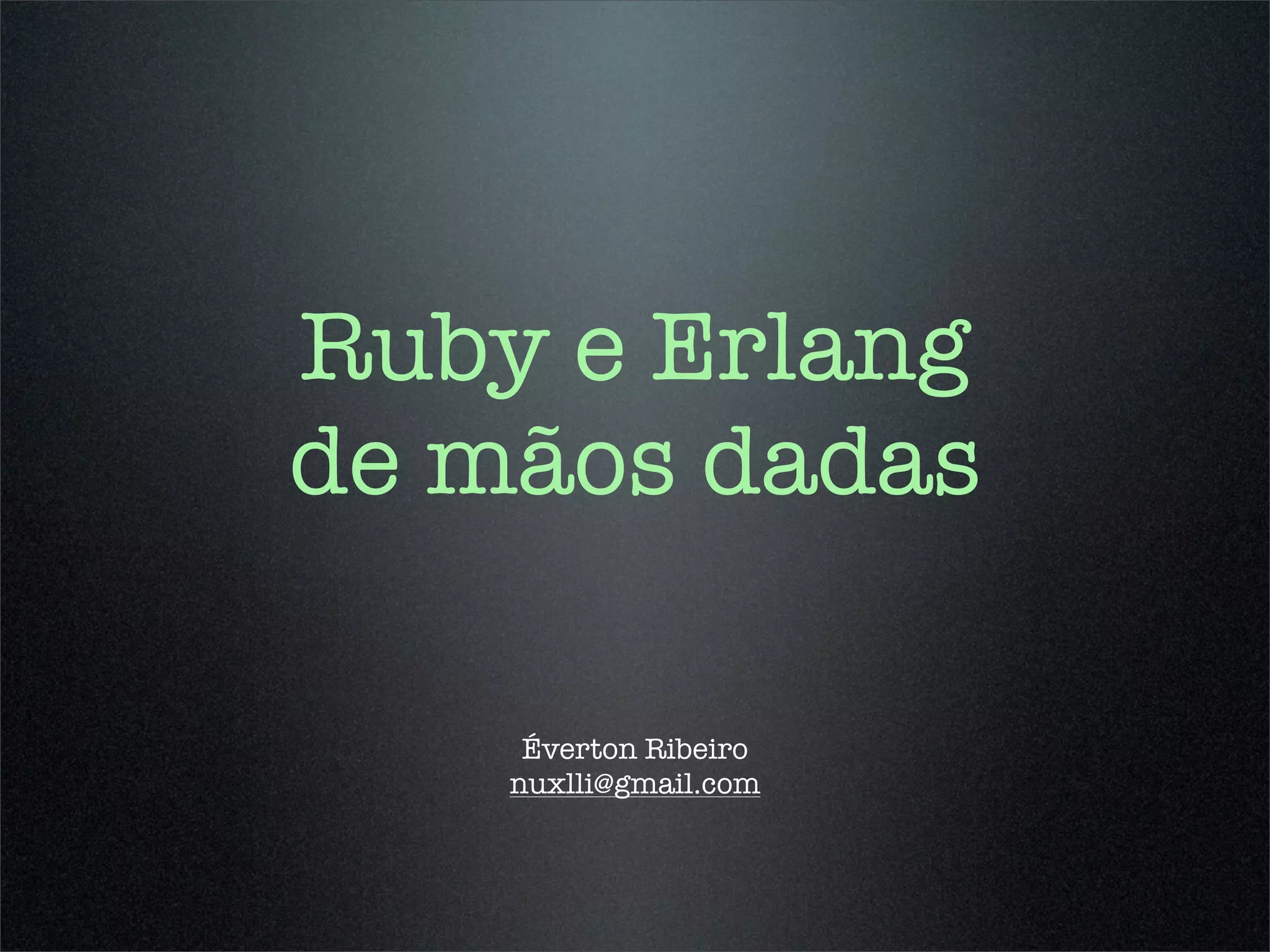 Este documento discute como combinar Ruby e Erlang para superar suas deficiências individuais. Ele propõe criar uma arquitetura que permita que as linguagens se beneficiem mutuamente, com Erlang fornecendo programação distribuída e desempenho, enquanto Ruby oferece produtividade e facilidade de desenvolvimento. A biblioteca rinterface é apresentada como uma forma de facilitar a comunicação entre os nós Erlang e aplicações Ruby.