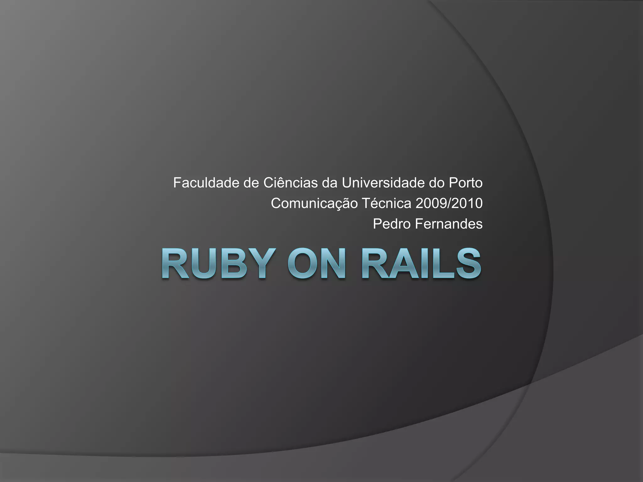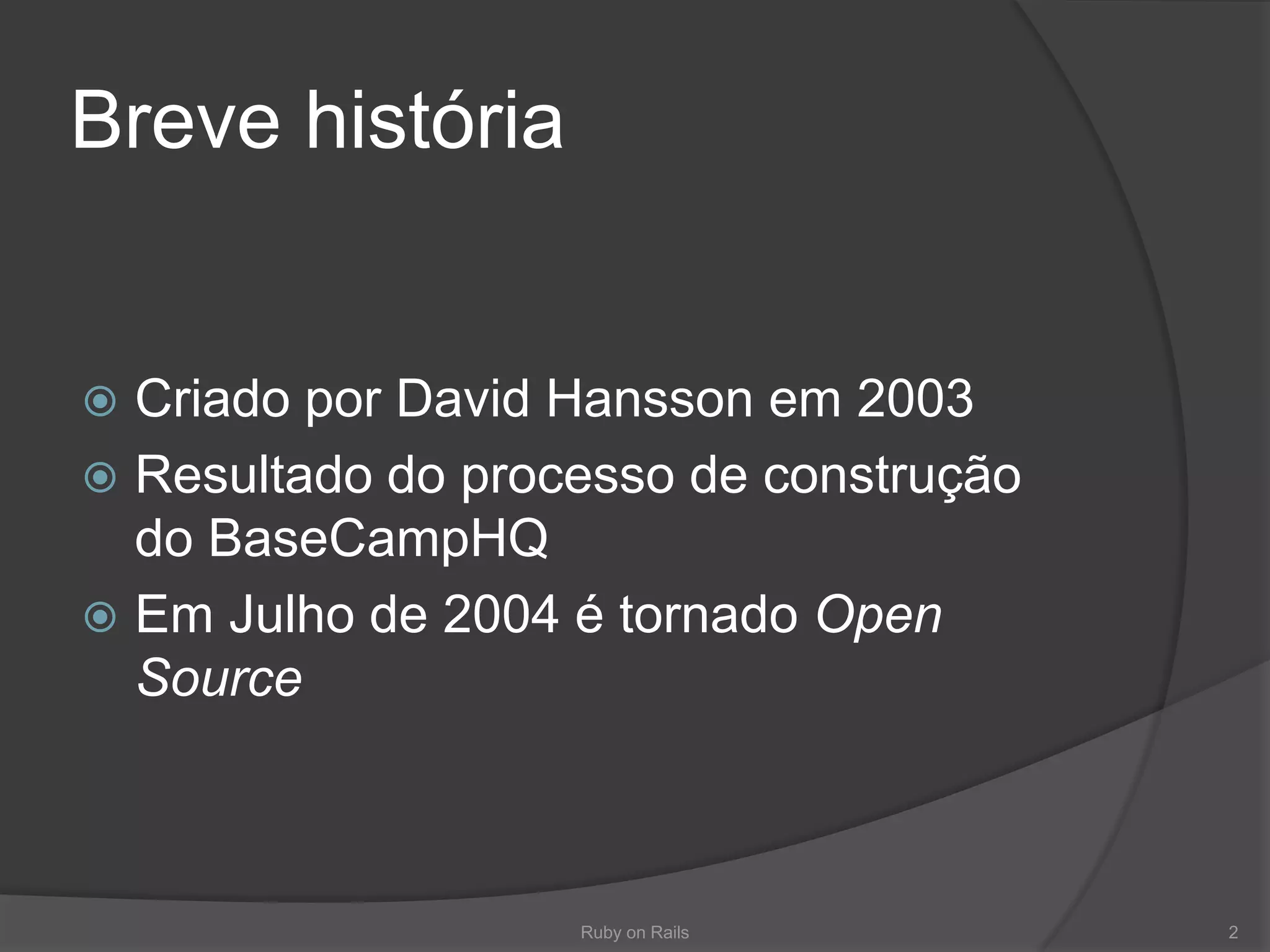O documento apresenta o framework Ruby on Rails, descrevendo sua história, características e arquitetura. É destacado que foi criado em 2003 por David Hansson para agilizar o desenvolvimento web e que se tornou de código aberto em 2004.