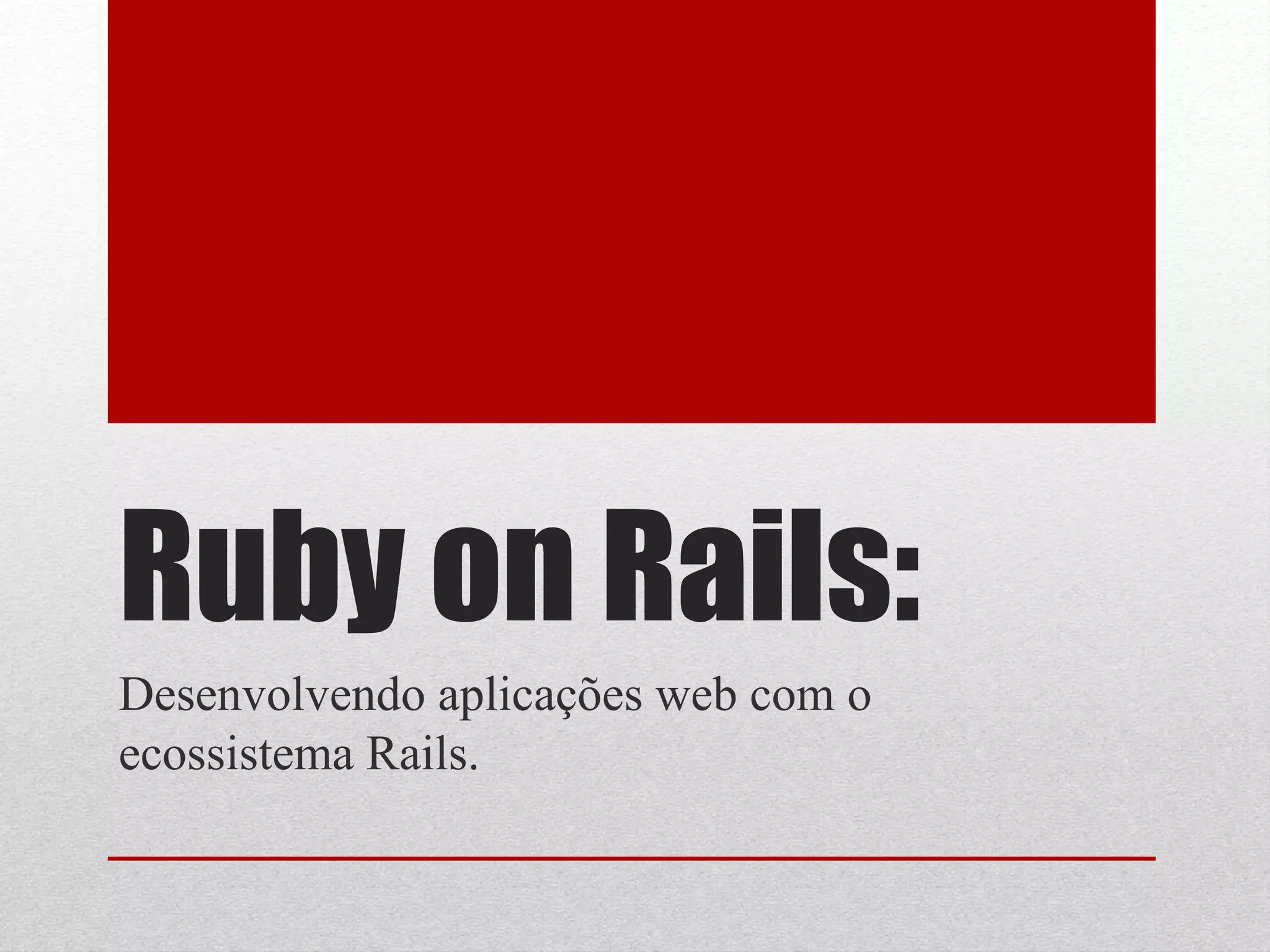 Este documento descreve Ruby on Rails, um framework web baseado na linguagem de programação Ruby. Ruby on Rails se destaca por utilizar o padrão MVC, o princípio DRY (Don't Repeat Yourself) e a convenção sobre configuração. Ele também fornece ferramentas como ActiveRecord para manipulação de dados e controladores baseados em REST.