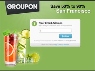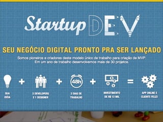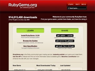 O documento discute o framework Ruby on Rails, notando que ele é focado em produtividade e permite adaptação sem dor, e que a comunidade é forte com ~45 mil bibliotecas. Exemplos de startups são dados que lançaram um MVP em 48 horas usando Rails.