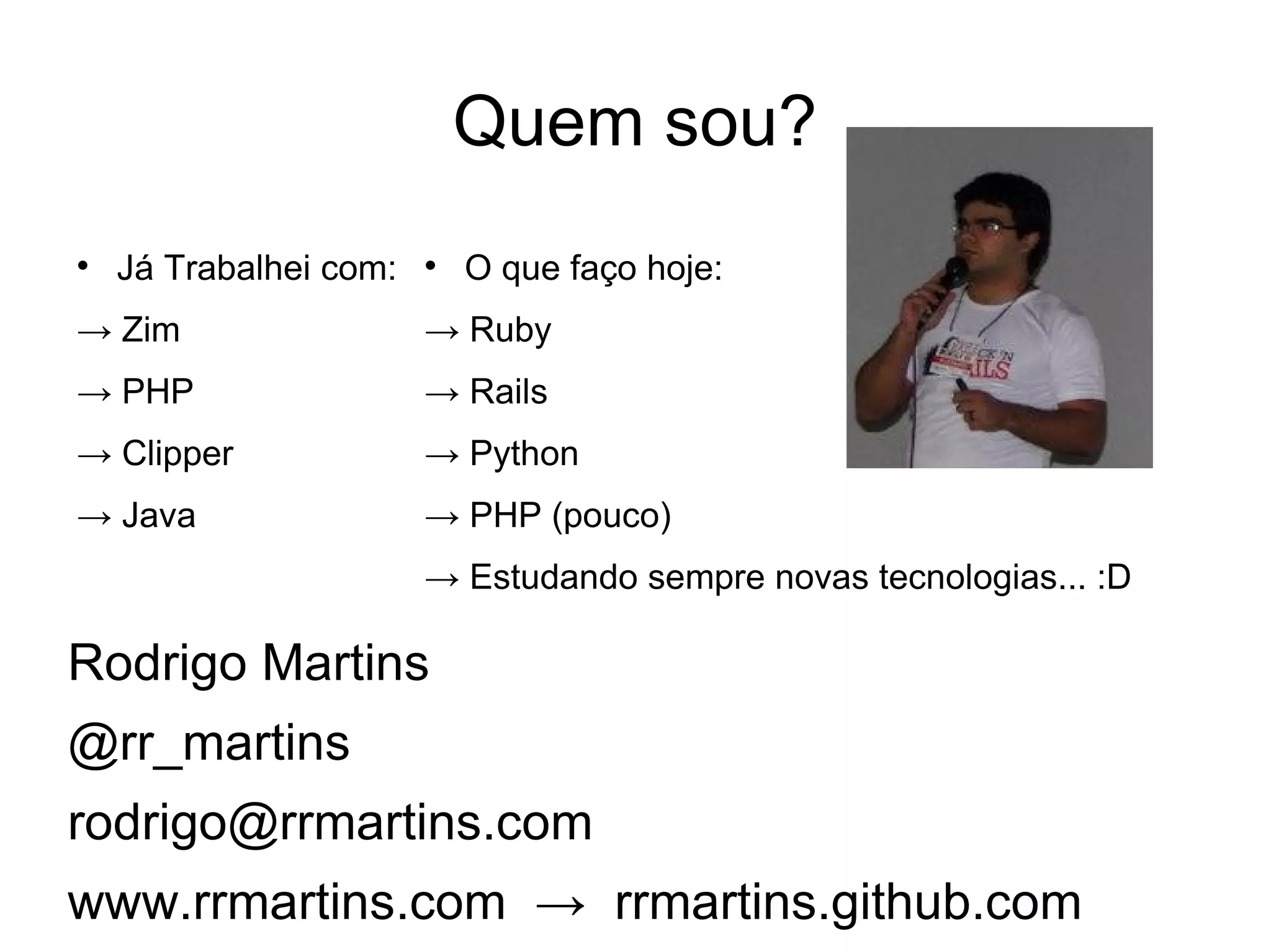 O documento descreve as vantagens de Ruby, incluindo sua simplicidade e expressividade. O autor também discute como Ruby permite a criação de domínios específicos através da metaprogramação.