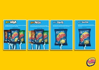 Este documento resume a história e estratégia de marketing da marca Ruffles no Brasil. Apresenta o conceito de que Ruffles está disponível para diferentes situações sociais, desde sozinho até em grupo. Também discute os concorrentes diretos e indiretos da marca, bem como possíveis problemas como falta de mídia e promessas de campanha que podem não ser cumpridas.