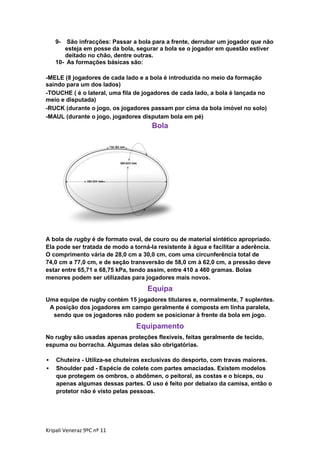 O documento fornece um resumo detalhado sobre as origens, regras e jogabilidade do rugby. Explica que o rugby foi inventado na Inglaterra em 1823 por William Webb Ellis e desde então se espalhou para outros países como Escócia, onde ocorreu o primeiro jogo internacional em 1871. Também descreve os equipamentos, pontuação, formações, penalidades e a arbitragem do esporte.