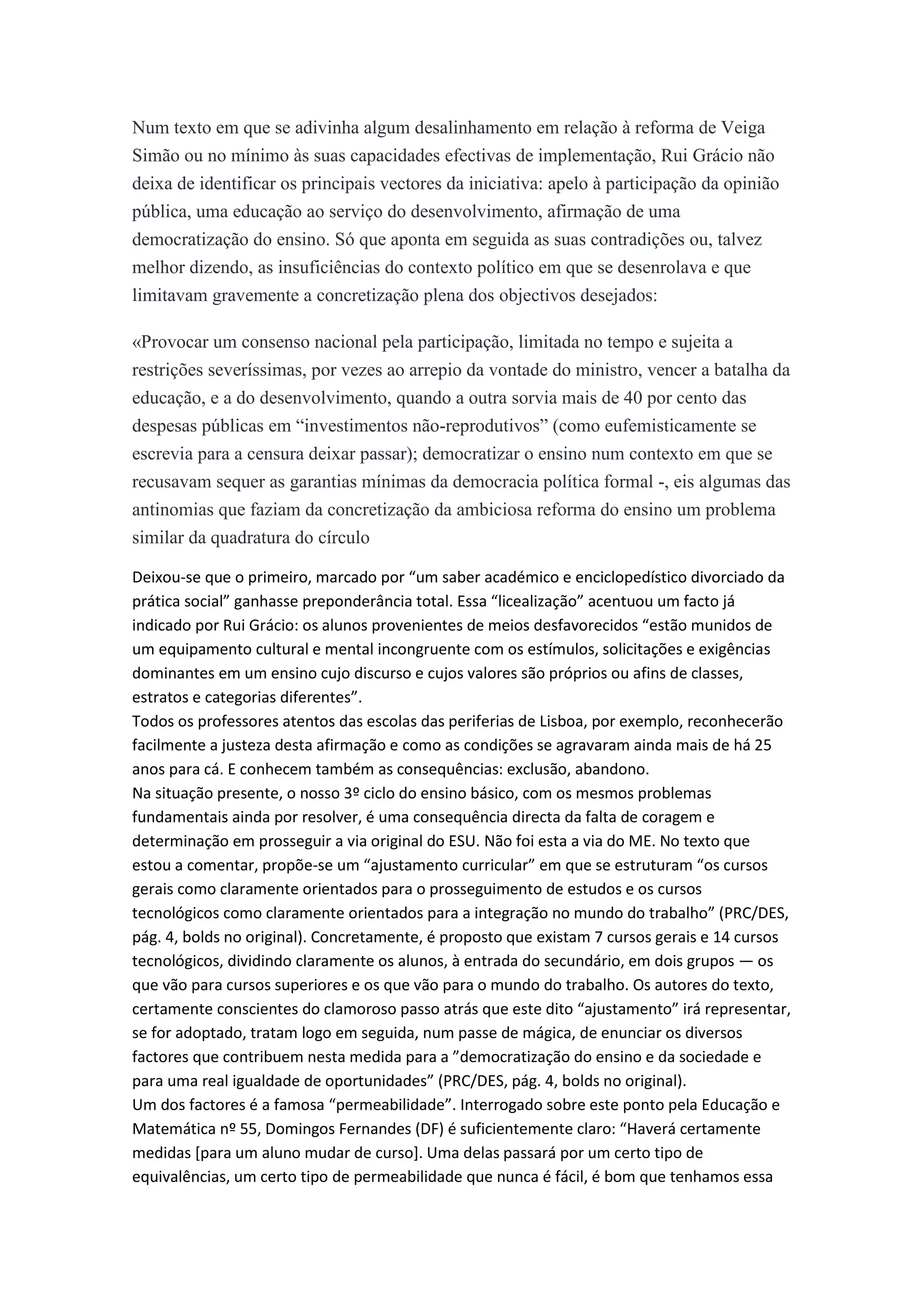 Este documento analisa as propostas do Ministério da Educação para reformar o ensino secundário em Portugal, dividindo os alunos em cursos gerais ou técnicos desde o início. O autor argumenta que esta abordagem irá (1) separar os alunos por capacidade acadêmica cedo demais, (2) dificultar a mudança de curso para aqueles inicialmente colocados em cursos técnicos, e (3) ter consequências negativas no ensino básico ao antecipar a separação dos alunos