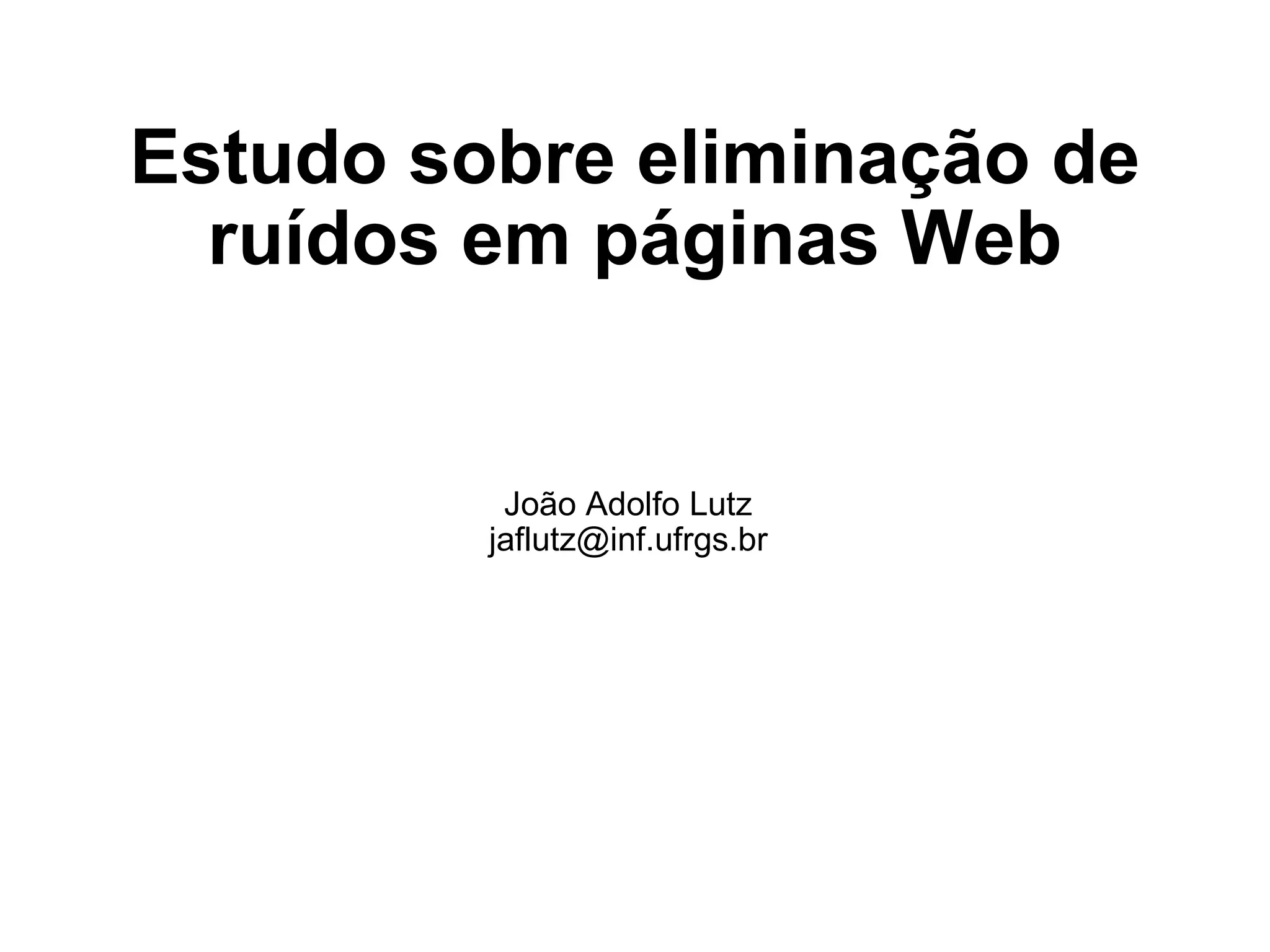 O documento discute técnicas para a eliminação de ruídos em páginas web. As técnicas são divididas em três grupos: identificação de blocos, segmentação visual e similaridade estrutural. Várias técnicas são descritas em cada grupo, incluindo suas abordagens e resultados.