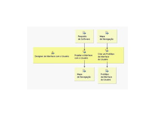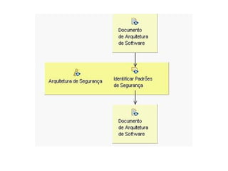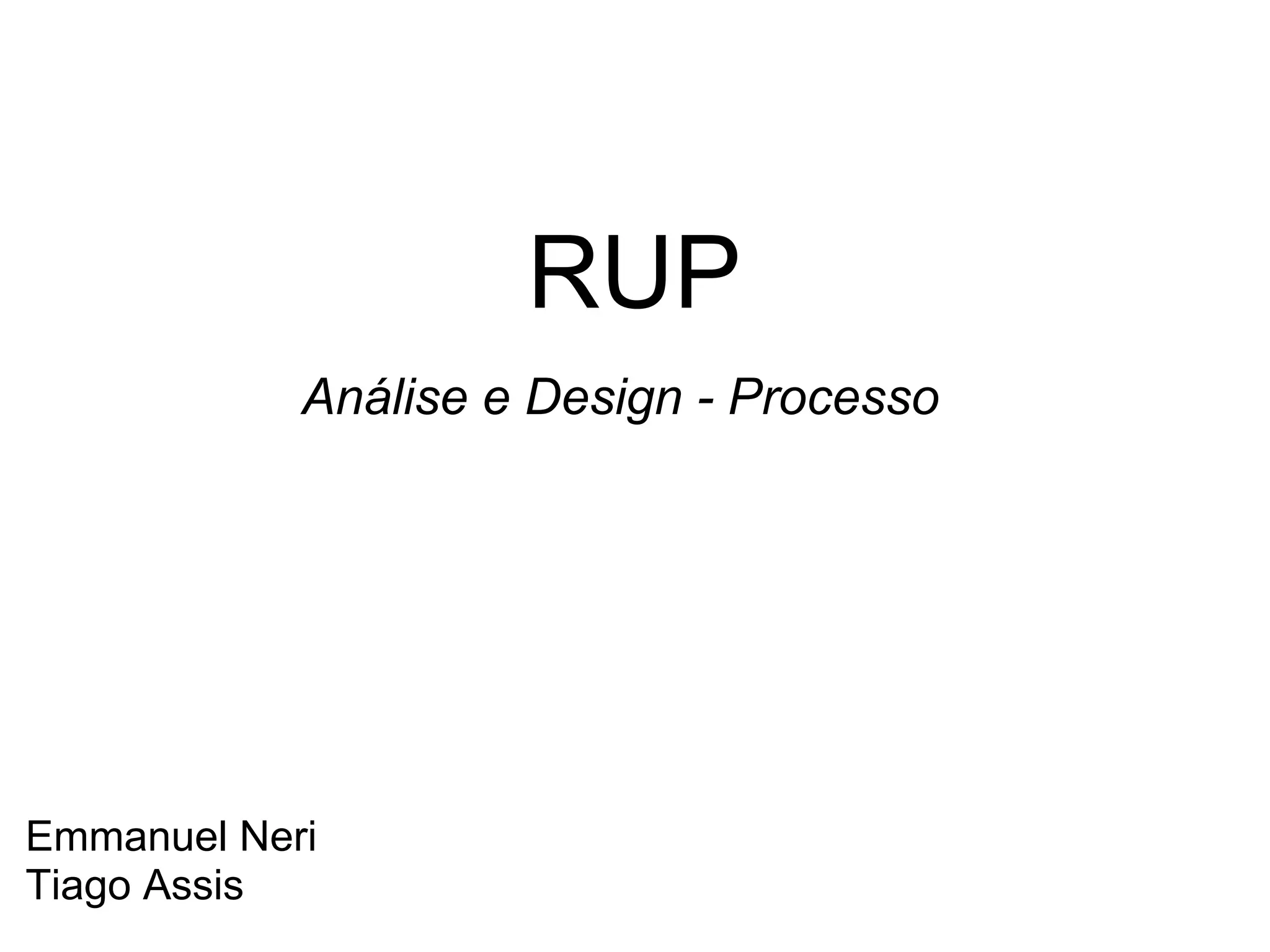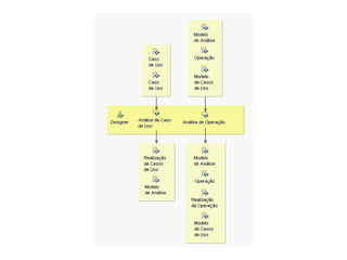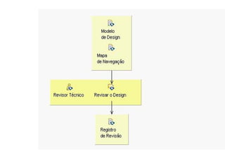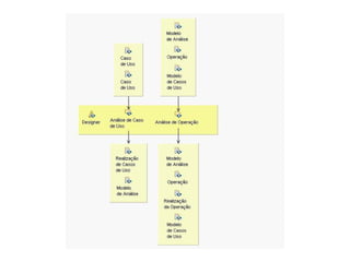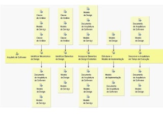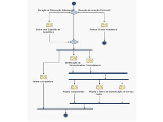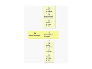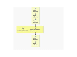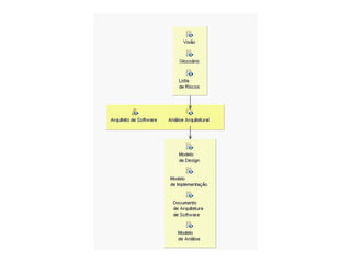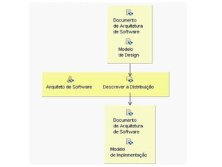 O documento descreve as fases e fluxos do processo de análise e design no RUP, incluindo a sugestão da arquitetura inicial, análise do comportamento para atender aos requisitos, e refinamento da arquitetura para integrar os novos elementos de design.