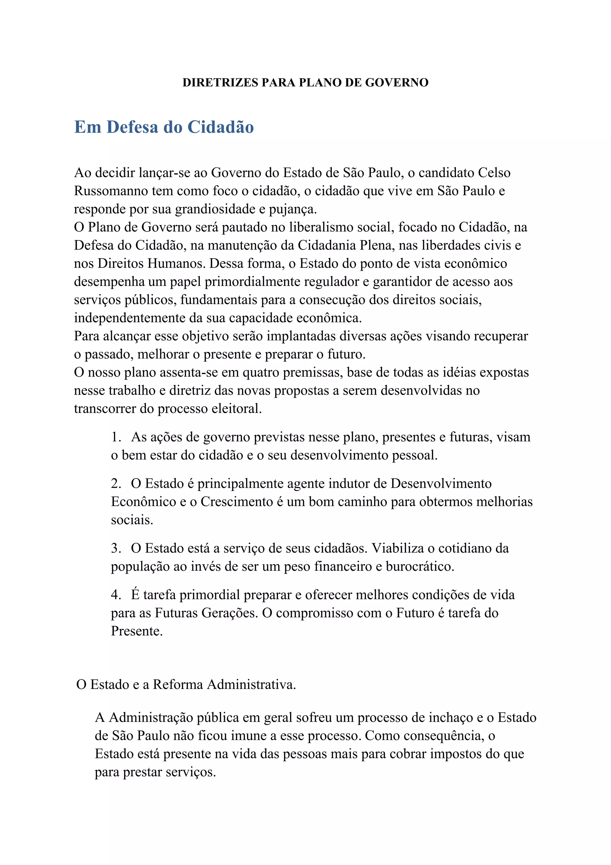 1) O plano de governo visa defender os direitos do cidadão e promover o desenvolvimento pessoal através de ações econômicas e sociais.