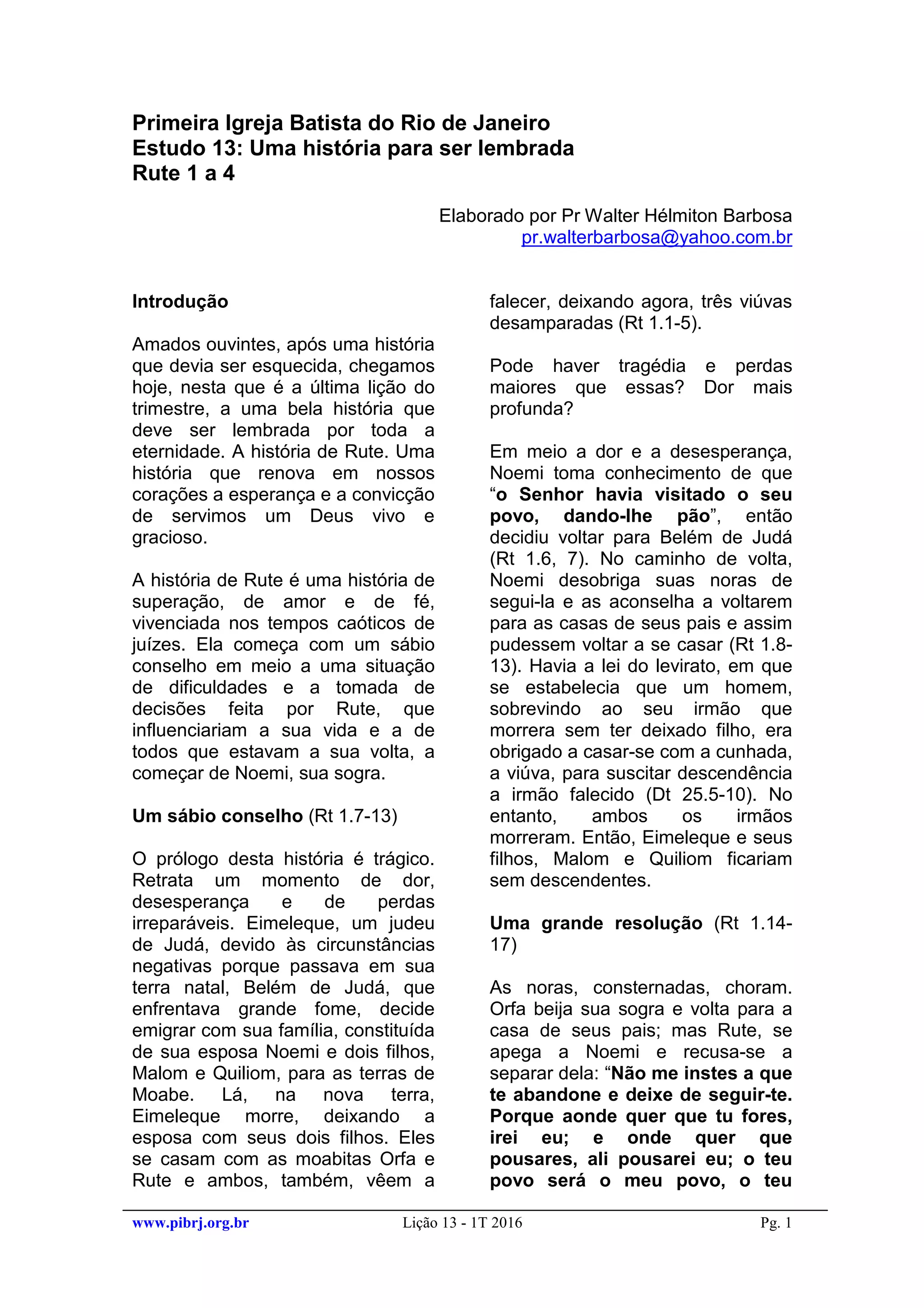 Este documento apresenta um resumo do livro bíblico de Rute em três partes: 1) Rute se recusa a abandonar sua sogra Noemi e promete ficar com ela; 2) Rute demonstra disposição para trabalhar nos campos de Boaz para sustentar ela e Noemi; 3) Rute acaba se casando com Boaz e dando à luz Obede, ancestral de Jesus, mostrando que Deus cuida de quem confia Nele.