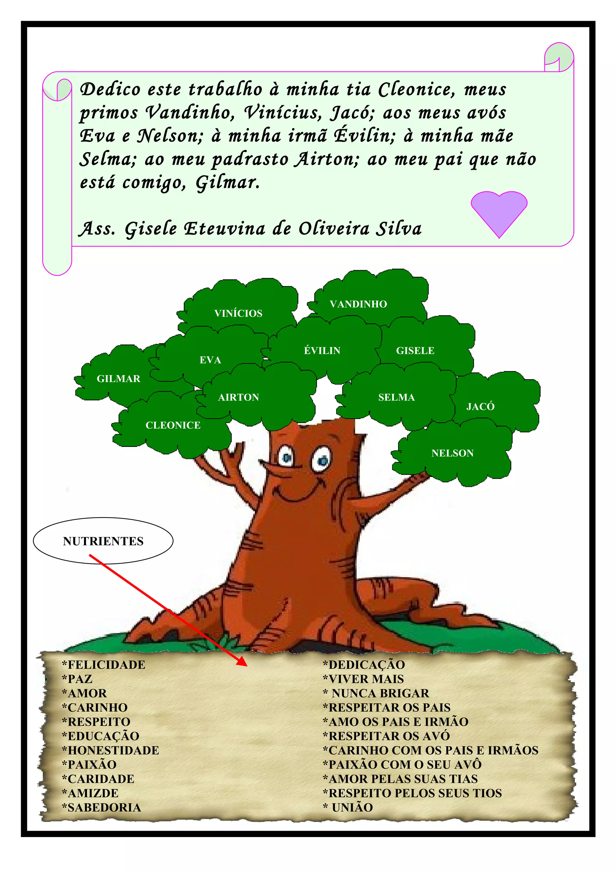 O documento é dedicado à família do autor, incluindo sua tia, primos, avós, irmã, mãe e pai. Ele também apresenta um diagrama genealógico da família do autor.