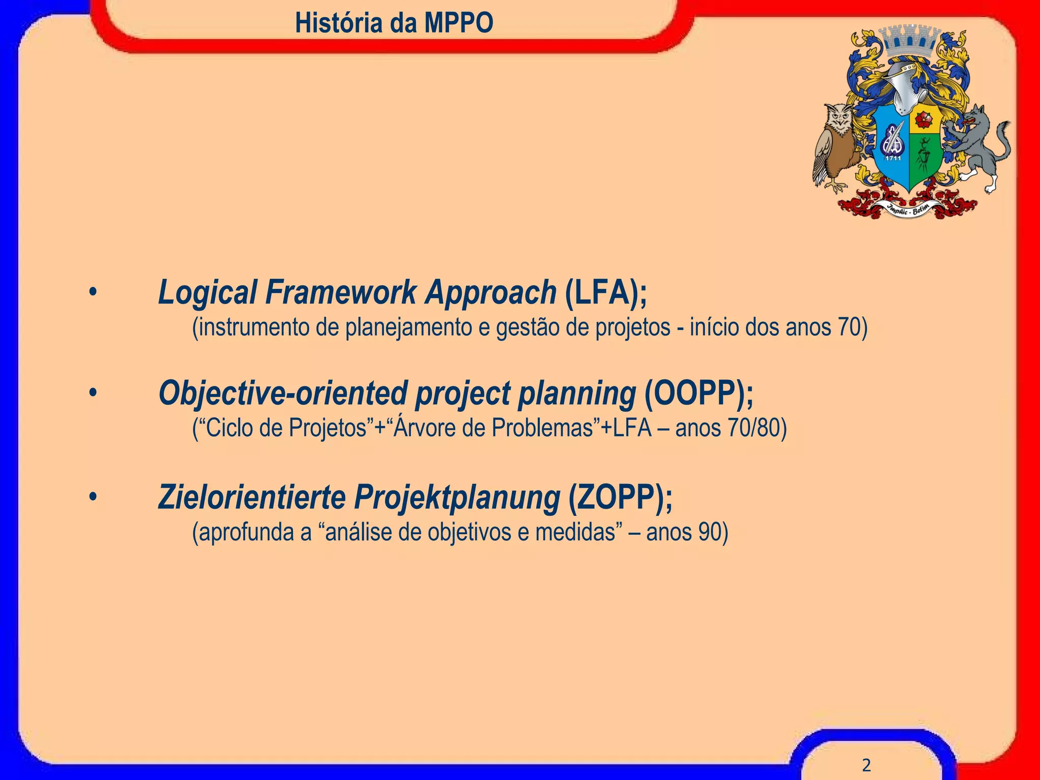 Este documento descreve a Metodologia de Planejamento de Projetos por Objetivos (MPPO), que inclui a construção de uma Árvore de Problemas para identificar as causas raízes dos problemas em um determinado campo de intervenção. A árvore é construída colocando cada problema em um post-it e organizando-os de forma hierárquica para mostrar quais problemas contribuem diretamente para o problema central identificado, bem como suas causas e efeitos. A árvore resultante fornece uma estrutura para entender as relações de causalidade entre os problemas