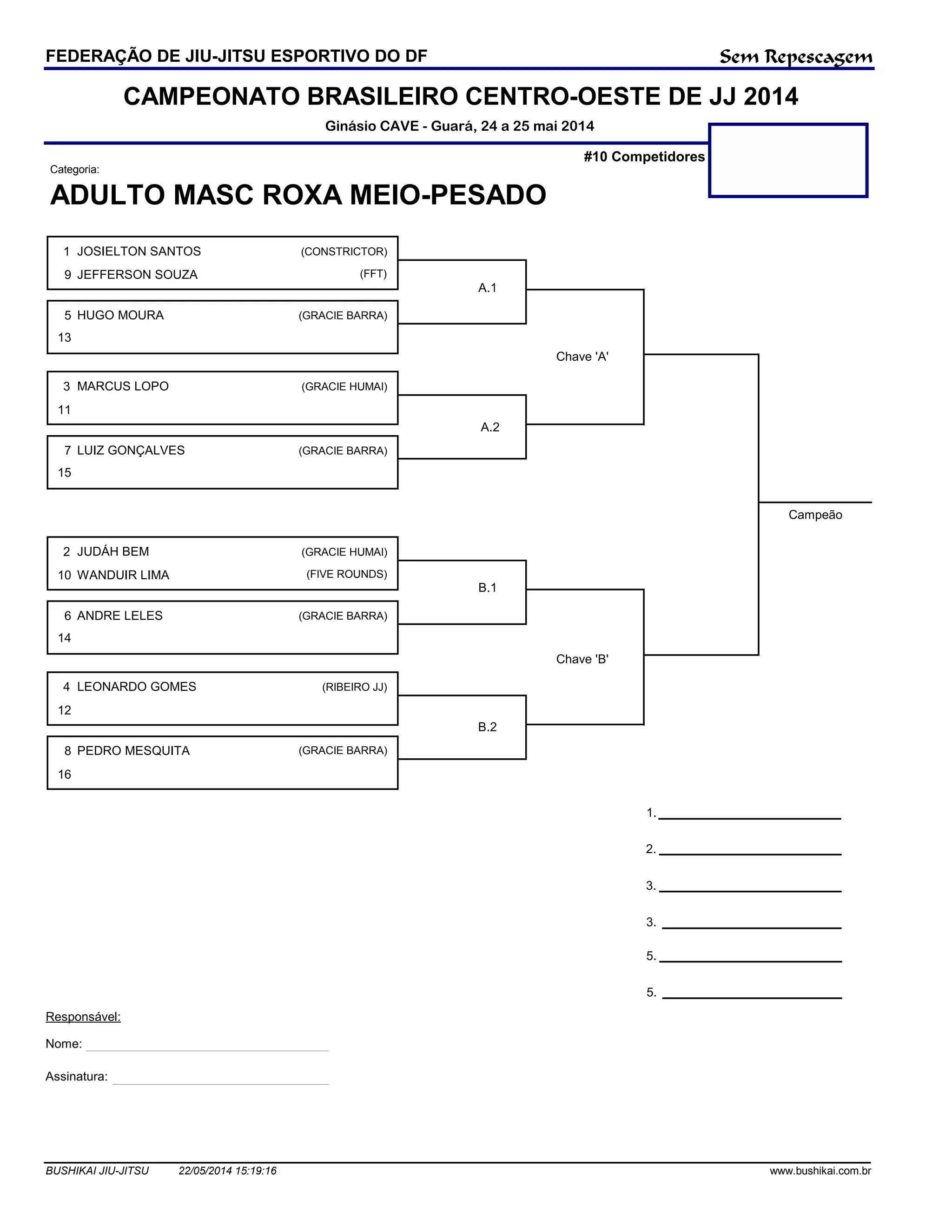 O documento descreve o campeonato brasileiro centro-oeste de jiu-jitsu de 2014 na categoria adulto masculino roxa meio-pesado, com 10 competidores divididos em duas chaves sem repescagem, vencido por Hugo Moura da Gracie Barra.