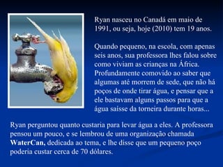 Ryan tinha 6 anos quando sua professora falou sobre crianças na África que morriam de sede por falta de água. Ele queria ajudar e conseguiu arrecadar fundos para perfurar seu primeiro poço, iniciando um trabalho que levou água a meio milhão de pessoas na África através de sua fundação.