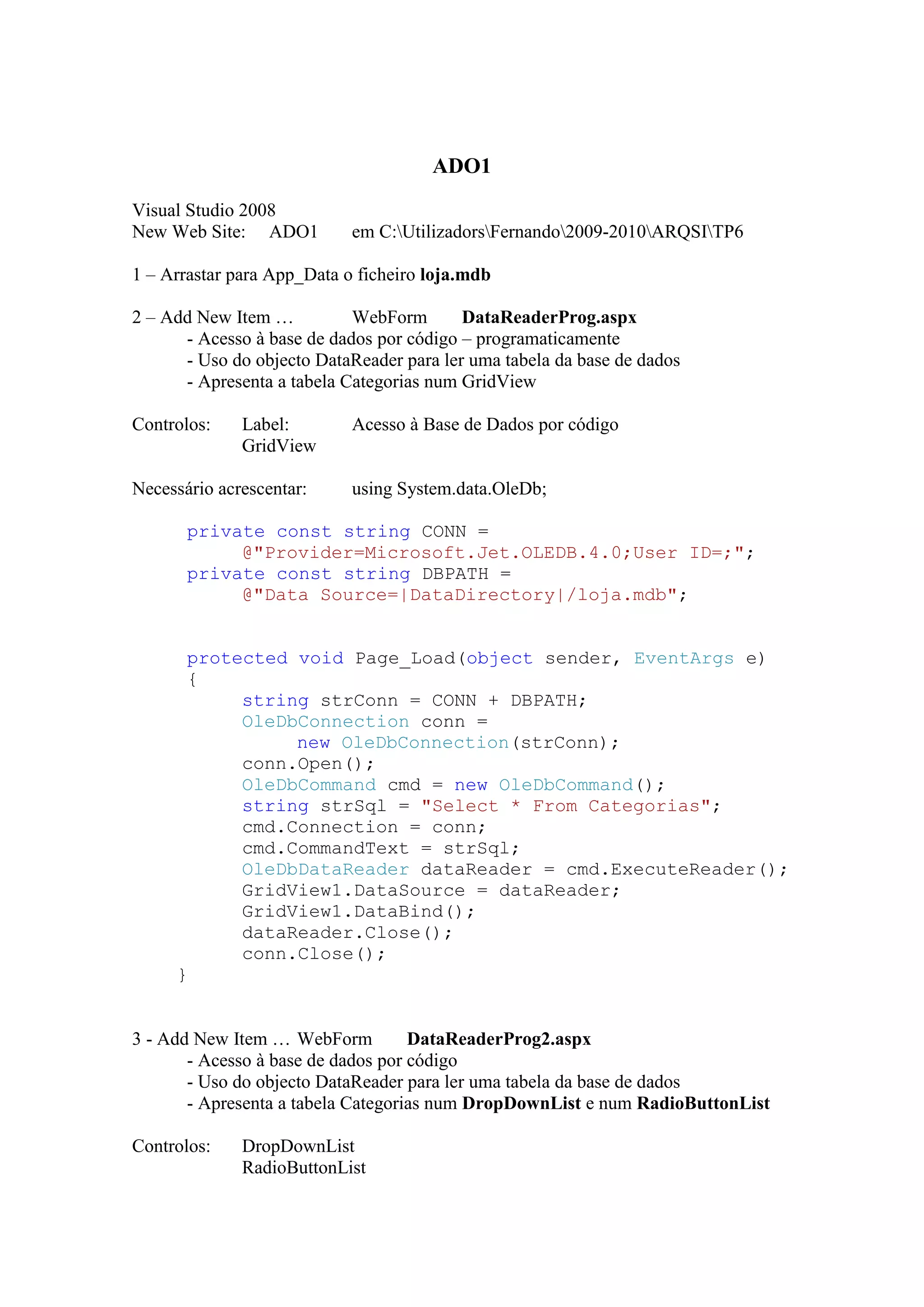 ADO1 Visual Studio 2008 NewWeb Site: ADO1 em C:UtilizadorsFernando2009-2010ARQSITP6 1 – Arrastar para App_Data o ficheiro loja.mdb 2 – Add New Item … WebForm DataReaderProg.aspx - Acesso à base de dados por código – programaticamente - Uso do objecto DataReader para ler uma tabela da base de dados - Apresenta a tabela Categorias num GridView Controlos: Label: Acesso à Base de Dados por código GridView Necessário acrescentar: using System.data.OleDb; private const string CONN = @"Provider=Microsoft.Jet.OLEDB.4.0;User ID=;"; private const string DBPATH = @"Data Source=|DataDirectory|/loja.mdb"; protected void Page_Load(object sender, EventArgs e) { string strConn = CONN + DBPATH; OleDbConnection conn = new OleDbConnection(strConn); conn.Open(); OleDbCommand cmd = new OleDbCommand(); string strSql = "Select * From Categorias"; cmd.Connection = conn; cmd.CommandText = strSql; OleDbDataReader dataReader = cmd.ExecuteReader(); GridView1.DataSource = dataReader; GridView1.DataBind(); dataReader.Close(); conn.Close(); } 3 - Add New Item … WebForm DataReaderProg2.aspx - Acesso à base de dados por código - Uso do objecto DataReader para ler uma tabela da base de dados - Apresenta a tabela Categorias num DropDownList e num RadioButtonList Controlos: DropDownList RadioButtonList