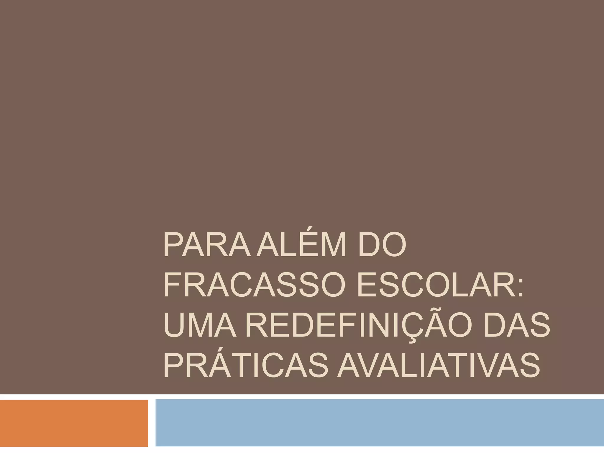 O documento discute as práticas avaliativas nas escolas brasileiras e propõe uma redefinição dessas práticas. Atualmente, a avaliação se baseia quase que exclusivamente nos resultados de provas, que usam uma linguagem diferente do dia a dia da sala de aula. Além disso, a avaliação é usada para punir em vez de ensinar. A proposta é mudar a avaliação para que ela ajude a alterar as ações e relações escolares de forma construtiva.