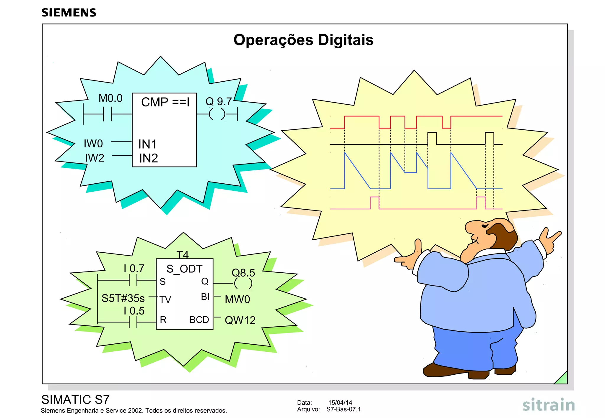 O documento descreve operações digitais e formatos de números no SIMATIC S7, incluindo instruções para contadores e temporizadores. É apresentado o funcionamento de contadores, instruções de bits para contadores e exemplos de temporizadores como ON Delay, Stored ON Delay e Pulse.