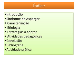 O documento discute a Síndrome de Asperger em crianças, incluindo caracterização, etiologia e estratégias pedagógicas. É proposto que as atividades devem se concentrar nos interesses da criança, promover a socialização e comunicação, e estabelecer regras claras. Exemplos de atividades incluem quebra-cabeças, classificação e perfuração.