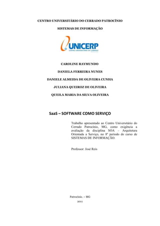 O documento discute o modelo de Software como Serviço (SaaS), definindo-o como software distribuído como um serviço online acessado via internet. Ele explora a evolução da TI que levou ao SaaS, incluindo a computação na nuvem, e como SaaS, Web 2.0 e SOA convergem para entregar software e serviços de forma flexível.