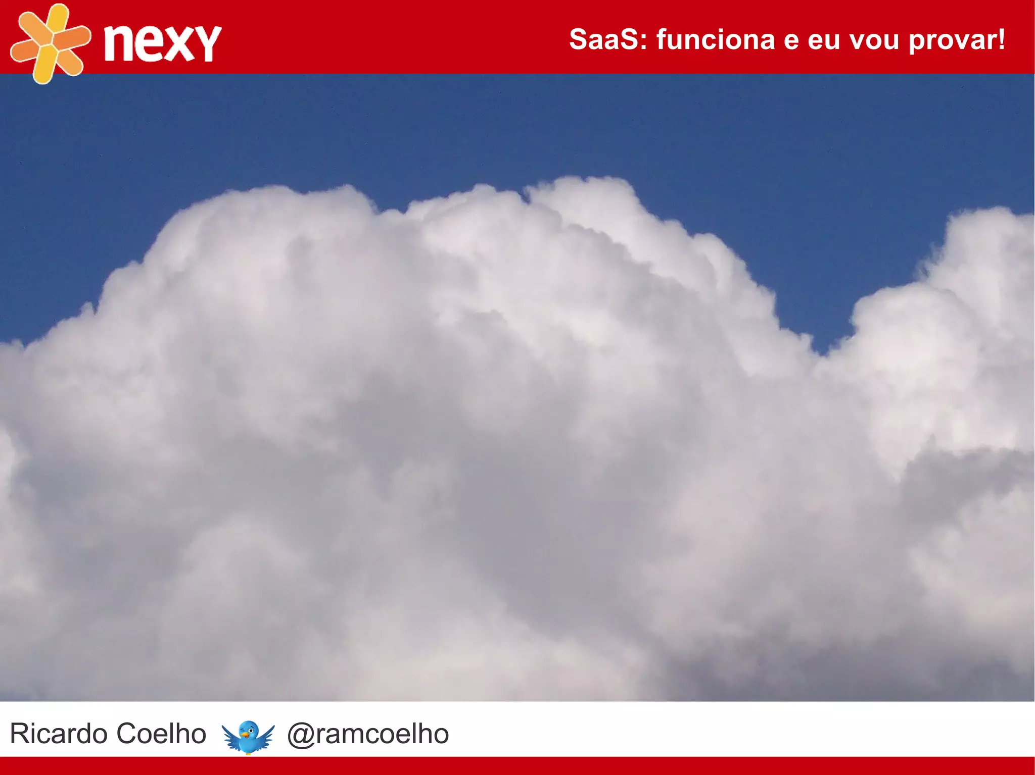 Ricardo Coelho apresenta os benefícios e desafios do modelo de negócios SaaS. Ele descreve sua experiência como CTO da Nexy, uma empresa que oferece soluções de segurança e auditoria financeira como serviços na nuvem. Coelho também discute questões como conformidade, propriedade intelectual e modelos de monetização para aplicações SaaS.
