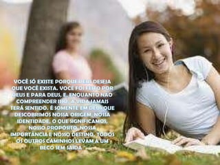 VOCÊ SÓ EXISTE PORQUE DEUS DESEJA QUE VOCÊ EXISTA. VOCÊ FOI FEITO POR DEUS E PARA DEUS, E, ENQUANTO NÃO COMPREENDER ISSO, A VIDA JAMAIS TERÁ SENTIDO.