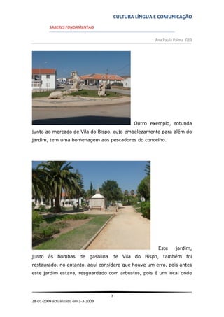 O documento discute como os saberes fundamentais incluem opiniões, aptidões pessoais e profissionais. Ele também descreve como as novas rotundas em Vila do Bispo homenageiam a história local e a importância da pesca. Finalmente, enfatiza a necessidade de continuar aprendendo ao longo da vida por meio de conversas, leitura e formação profissional.