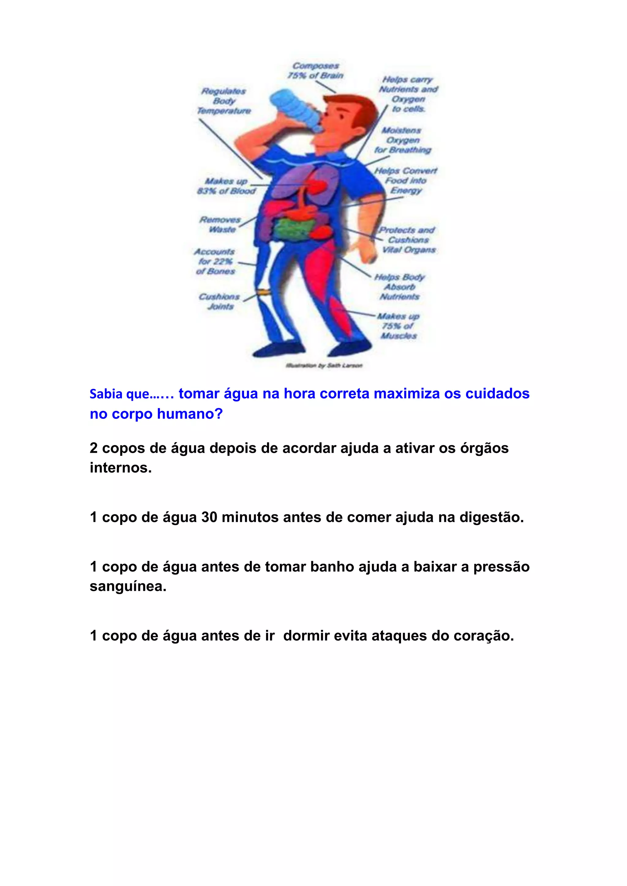 Tomar água em momentos específicos do dia pode trazer benefícios à saúde, como ativar os órgãos internos ao tomar dois copos depois de acordar, facilitar a digestão ao beber um copo meia hora antes das refeições, controlar a pressão sanguínea ao beber antes do banho, e prevenir ataques cardíacos ao ingerir água antes de dormir.