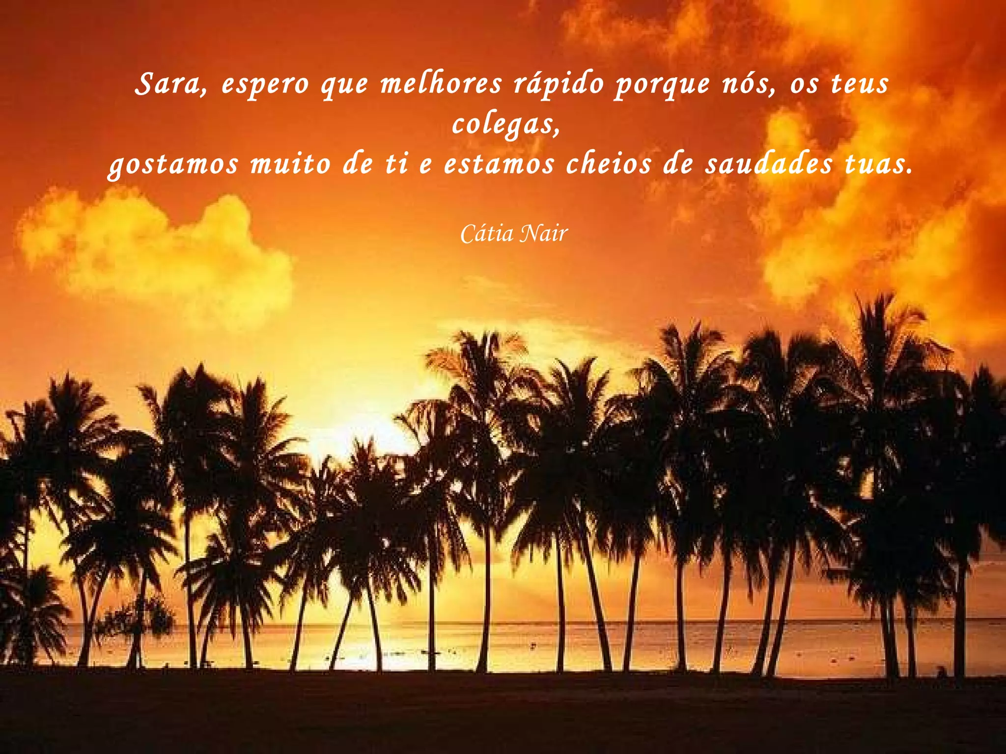 Sara, espero quemelhores rápido porque nós, os teus colegas, gostamos muito de ti e estamos cheios de saudades tuas. Cátia Nair
