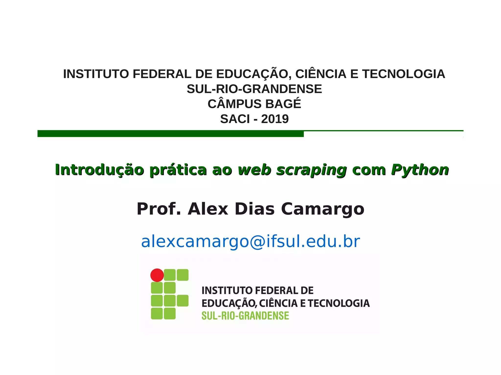 O documento apresenta uma introdução prática ao web scraping com Python. Apresenta o professor, os objetivos da oficina, as ferramentas utilizadas e exemplos práticos de scraping de páginas da Wikipédia e de dados esportivos para construção de datasets.