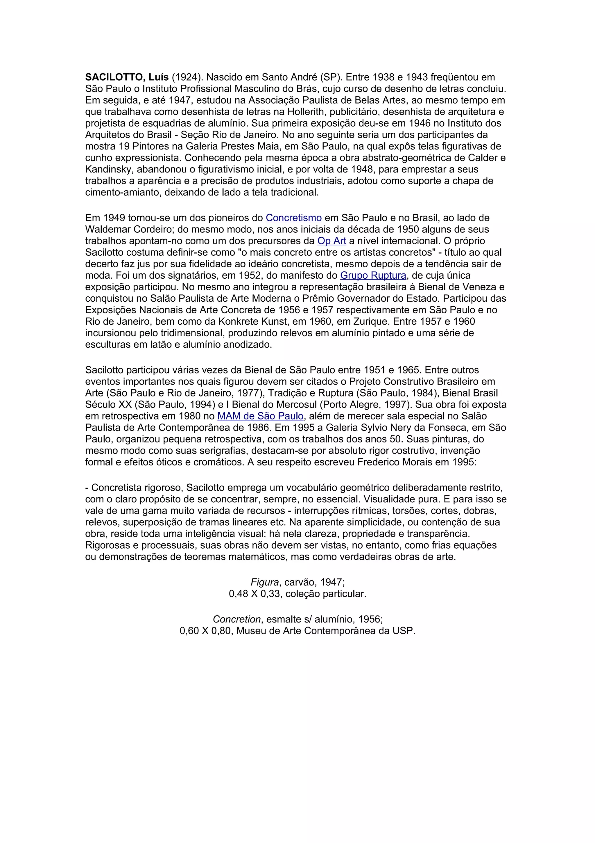 Luís Sacilotto (1924-presente) foi um pintor brasileiro pioneiro do Concretismo em São Paulo. Estudou desenho de letras e pintura na década de 1940, adotando inicialmente um estilo figurativo expressionista. Posteriormente, influenciado pela obra de Calder e Kandinsky, abandonou o figurativismo em favor da abstração geométrica, usando chapas de cimento-amianto como suporte. Sacilotto participou de importantes exposições e grupos concretistas na década de 1950, destacando-se por seu rigor constr
