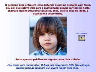 O menino Zeca fica com raiva do amigo Juca e deseja que ele fique doente. Seu pai pede que Zeca jogue pedaços de carvão em uma camisa no varal, imaginando que é o Juca. Após se sujar todo, o pai mostra a Zeca que, assim como ele se sujou ao invés da camisa, os maus pensamentos acabam sujando a nós mesmos.